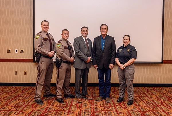 Governor Larry Rhoden joins DPS Cabinet Secretary Robert Perry, Col. Casey Collins, and award recipients Trooper Joseph Peterson and Inspector Kelly Oxender at the 13th Annual South Dakota Highway Patrol Awards Ceremony. Peterson (L) and Oxender (R) were recognized as the 2024 Trooper and Inspector of the Year.