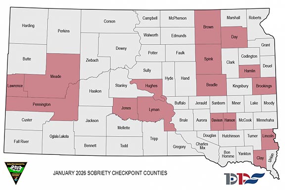 PIERRE, S.D. - The South Dakota Highway Patrol will hold sobriety checkpoints in 16 counties throughout the month of January. Checkpoints are planned for Beadle, Brookings, Brown, Clay, Davison, Day, Hamlin, Hanson, Hughes, Jones, Lawrence, Lincoln, Lyman, Meade, Pennington, and Spink counties.